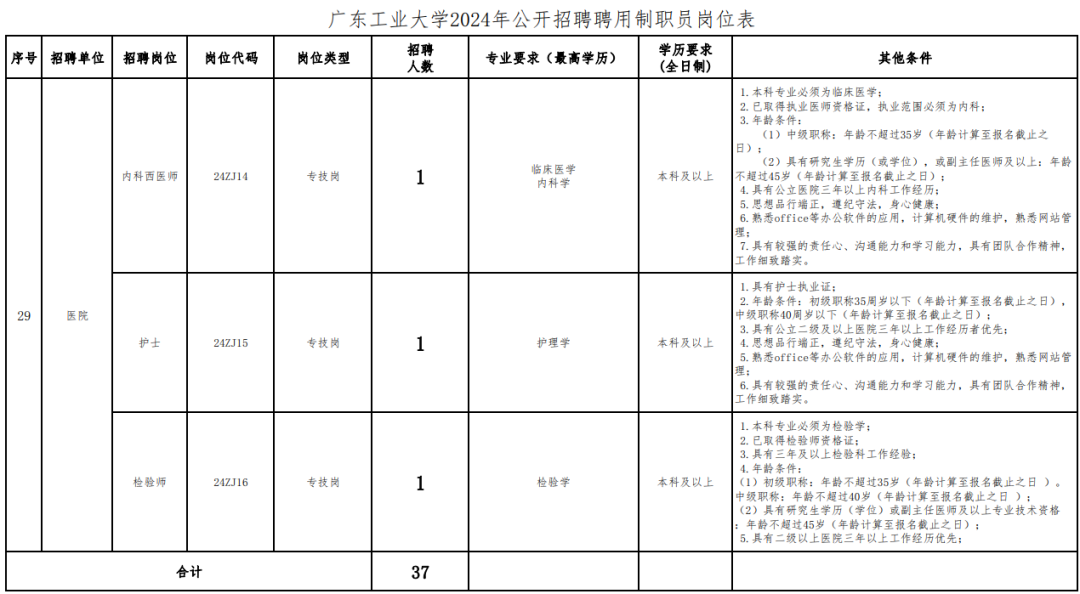 体育学院、校医院等岗位的年龄要求详见《 附件1:广东工业大学2024年公开招聘聘用制职员岗位表》。