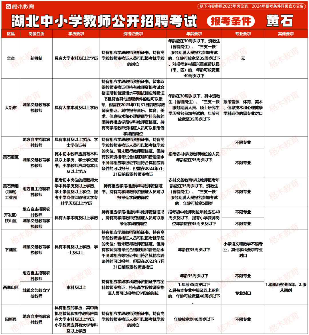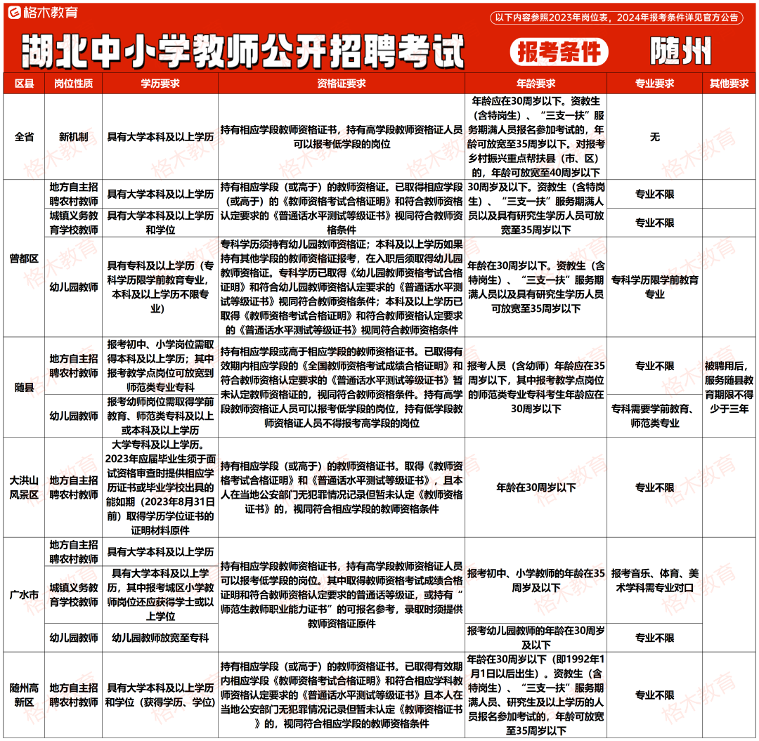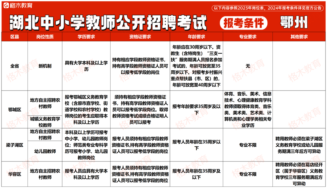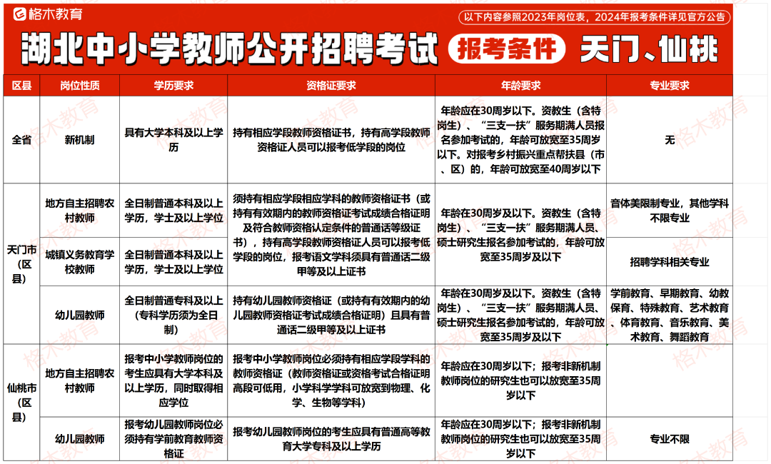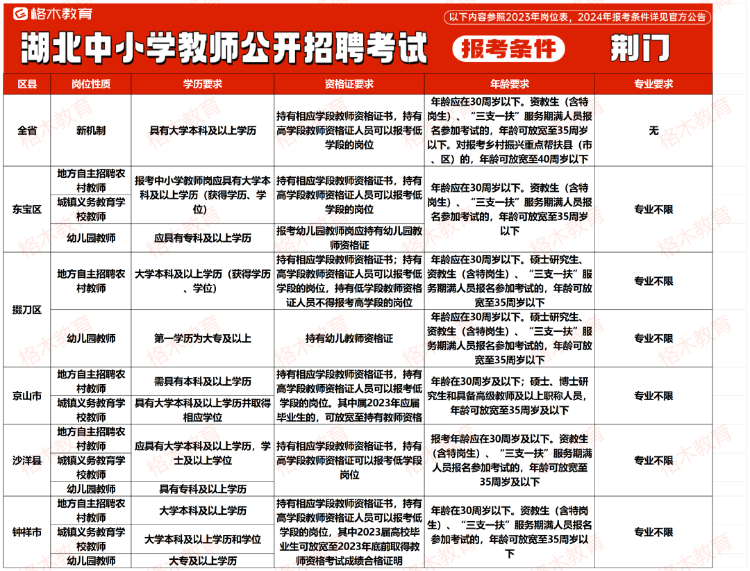 目前湖北中小学教师公开招聘的报考条件相对来说没那么高,大部分地市不限专业,还有一部分地市专科有岗。下面是23年各个地市报考条件,给大家做个参考。