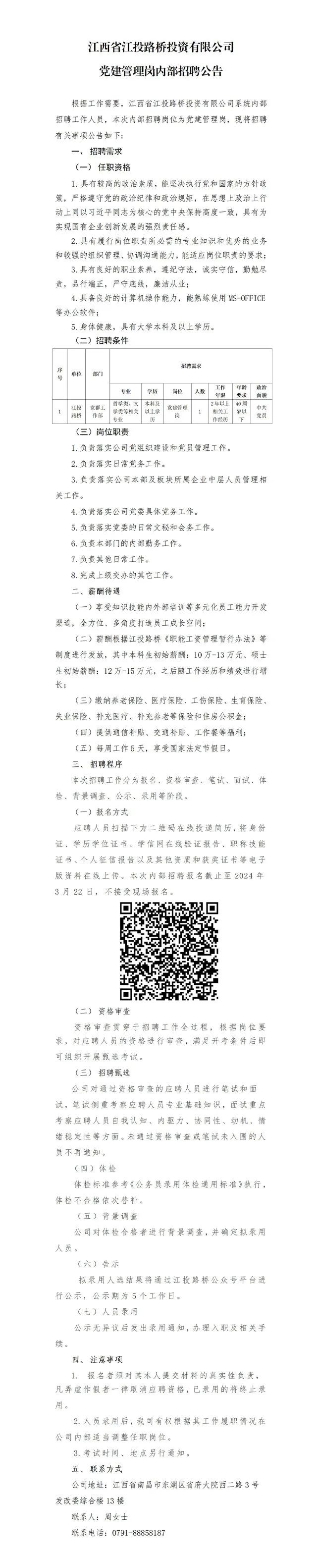 江西招聘:江西省江投路桥投资有限公司党建管理岗内部招聘公告