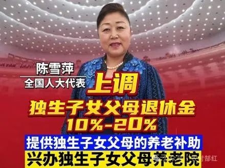 朋友们,你们有没有想过,在这个日新月异的社会里,啥事儿变得最快?不是科技,也不是时尚潮流,而是咱们身边的老龄化速度!想想看,身边越来越多的叔叔阿姨、爷爷奶奶步入了晚年,而养老问题,也成了咱们这代人绕不开的话题。最近,全国人大代表陈雪萍的一个提议,可是引起了大家的广泛关注,她建议给独生子女父母涨养老金,幅度在10%-20%之间。这事儿一出来,网上可是炸开了锅,大家都说:“太需要了!”