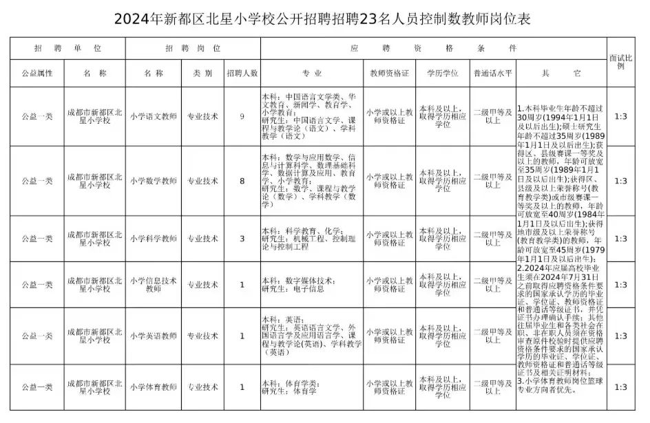 应聘人员报名前应认真阅读本公告以及《2024年新都区北星小学校面向社会公开招聘23名人员控制数教师岗位表》(附件)等信息。