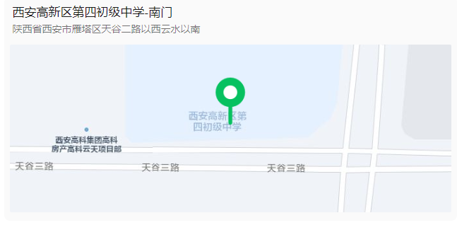 西安高新区第四初级中学(西安高新一中第一分校)是由西安高新区管委会创办、西安高新一中“名校+”教育联合体统一管理的一所公办初级中学。学校地处西安高新科技产业发展中心—丝路软件城,总占地面积65.5亩,建筑面积5.15万平方米,规划办学规模36个班,1800个学位。