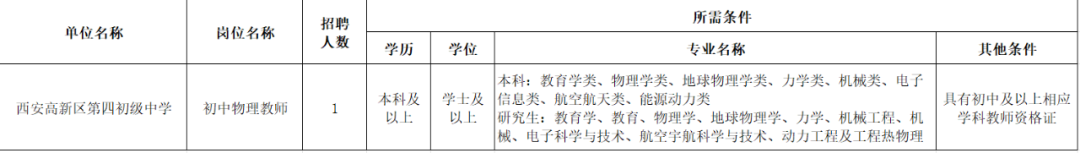 为加强我校教师队伍建设,切实做好学校教师队伍配备,西安高新区第四初级中学公开招聘物理教师1名。