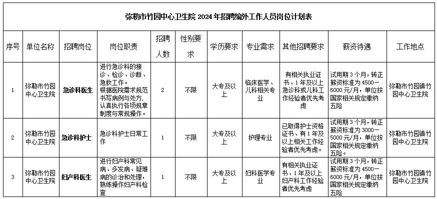 原标题:弥勒市竹园中心卫生院 2024年编外工作人员招聘公告