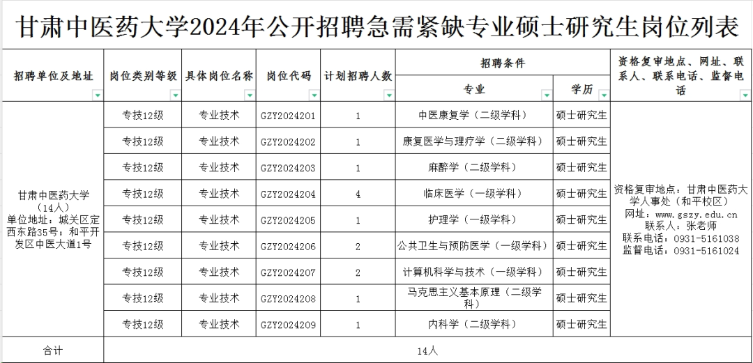 根据《关于省直事业单位引进高层次和急需紧缺人才相关工作的补充通知》(甘组通字〔2019〕111号)和《关于印发<2022-2024年省属高校、科研院所和医疗卫生机构等单位急需紧缺专业目录>的通知》(甘组通字〔2022〕173号)精神,经学校研究,现面向社会公开招聘急需紧缺专业硕士研究生14名。现将有关事项公告如下: