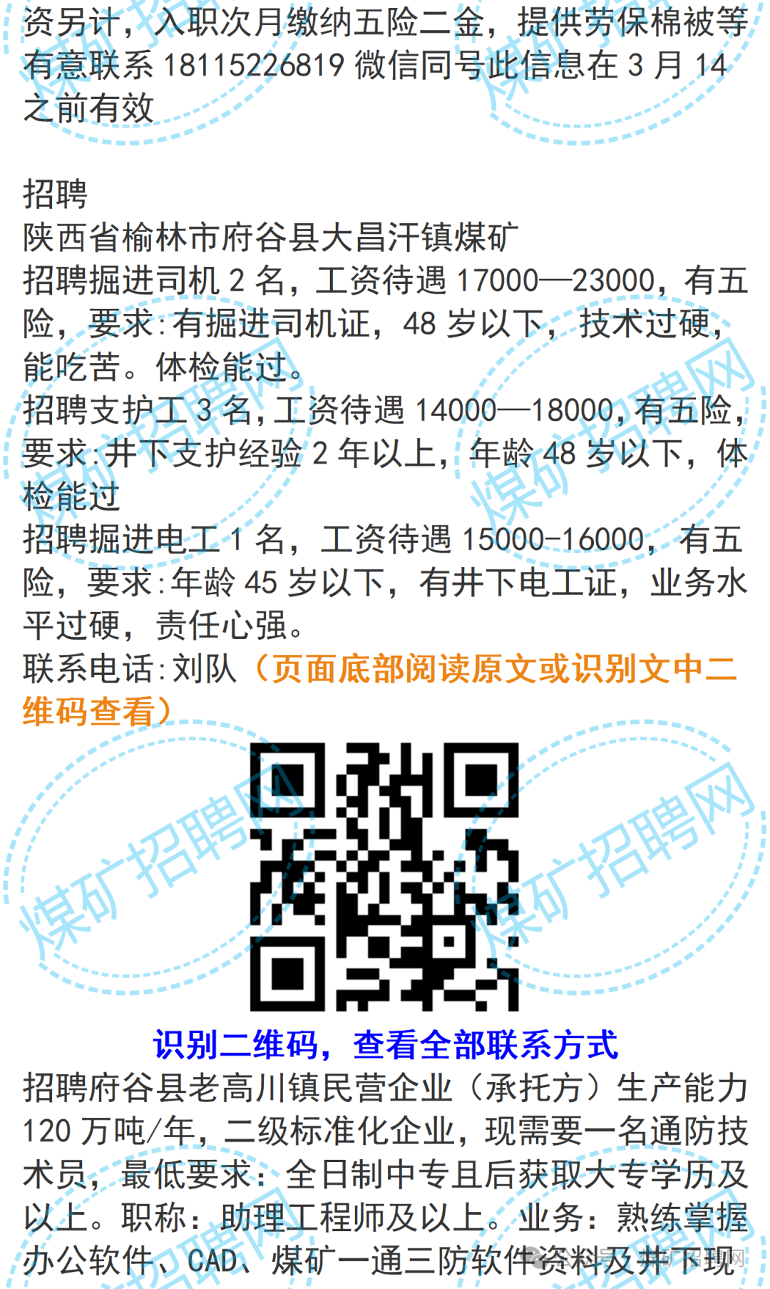 府谷一煤矿综掘队招三名带安全员证件支护工,证件每月补贴1000元;招带证件专业探放水工两名,有意者联系李工,13994669280