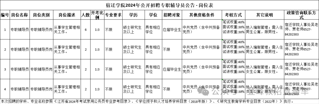 宿迁学院人事处负责回答此次招聘政策咨询。