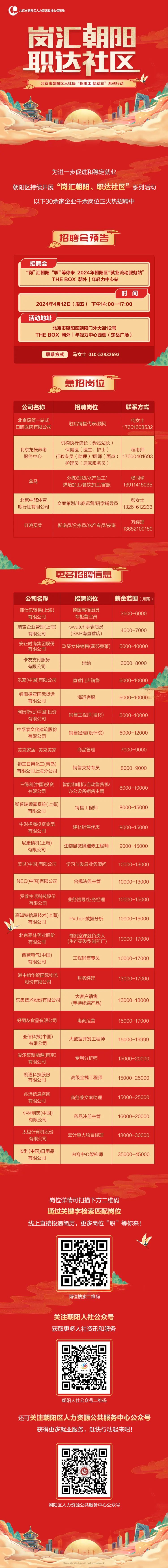 本期招聘大厅精心挑选了近2000个位于朝阳区的岗位,部分岗位详情可在长图中查看。