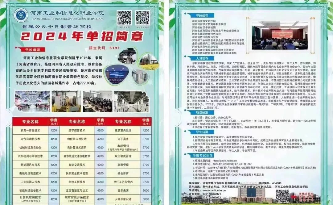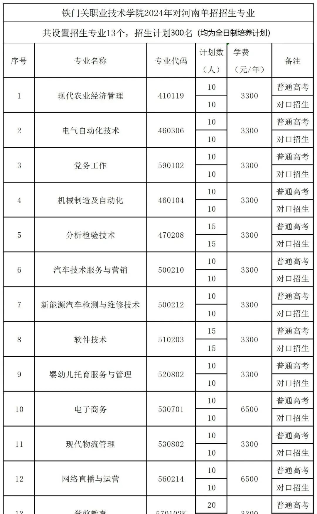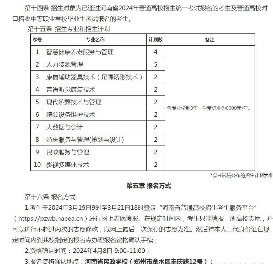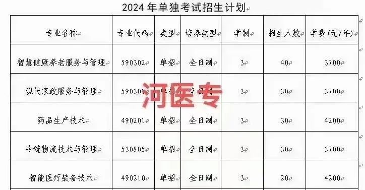 河南省2024年单独招生专业及计划