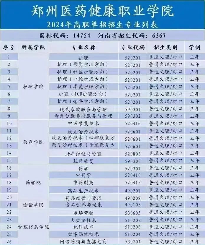 5.郑州卫生健康职业学院2024年单招招生专业