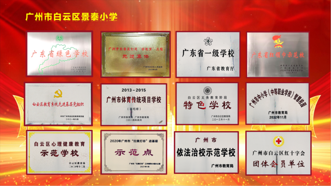 多年来,在各级领导的关心支持下,在全体教职员工的共同努力下,学校办学成绩显著,硕果累累,先后被评为省一级学校、省特级综合档案管理单位、省红领巾示范学校、省绿色学校、省校本培训示范校、省现代教育技术实验校、广州市安全文明校园、广州市依法治校示范学校、广州市科技特色(模型)学校、白云区心理教育示范校等。2023年9月,学校荣获白云区人民政府授予的白云区创建“好教育”工程先进集体荣誉,充分发挥了区域示范引领作用。