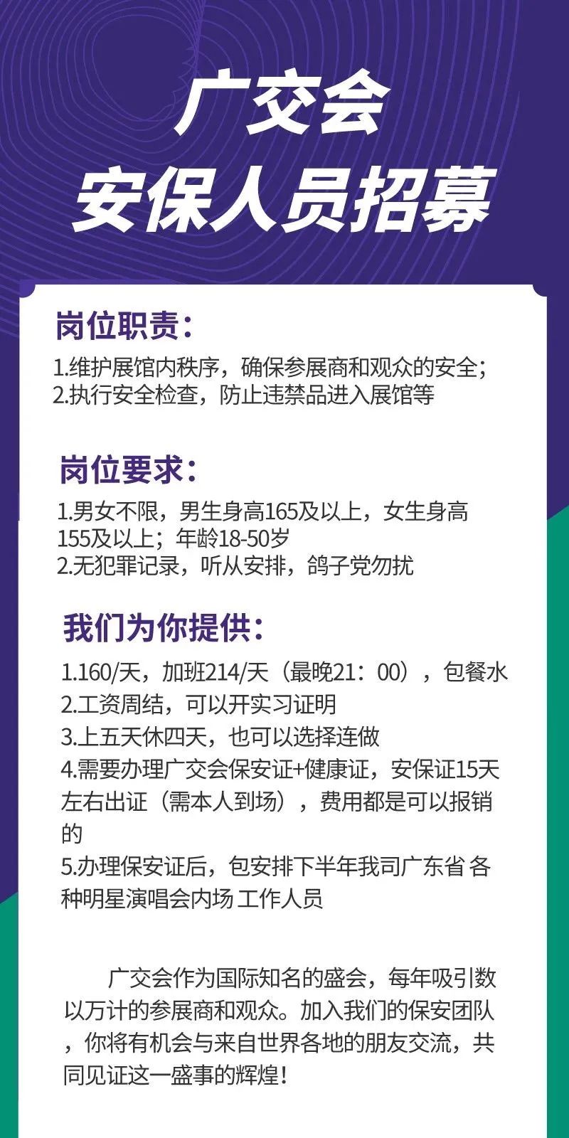 工资周结,160-214元/天,招募广交会安保兼职!男女不限,还有下半年明星演唱会内场福利~