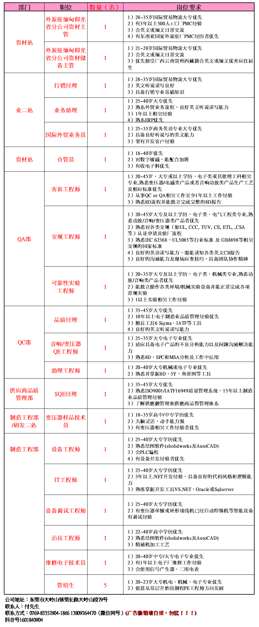 公司成立于1993年,是一家专业生产变压器、音响、功放、分音器等产品的大型台资独资企业,产品远销欧美、日本等地。在职员工1200+人,位于东莞市大岭山镇,毗邻107国道环境优美,距东莞市区及深圳半小时车程,交通便利。发薪准时,包住,社会化福利性营运自主选择多样性餐厅,餐补450~540元/月,月薪5天8小时制,视公司运营状况发放留任奖金或年度营运奖金。