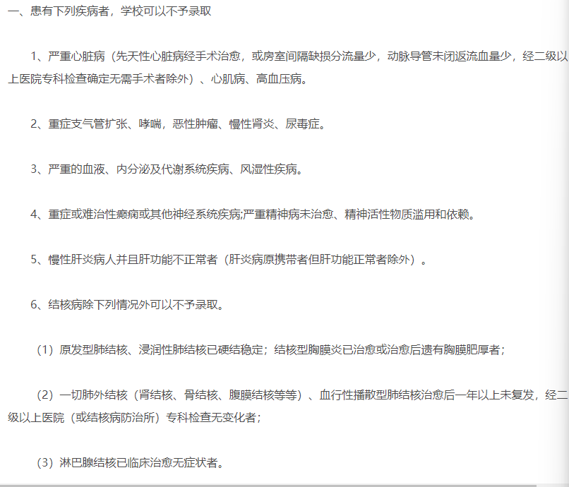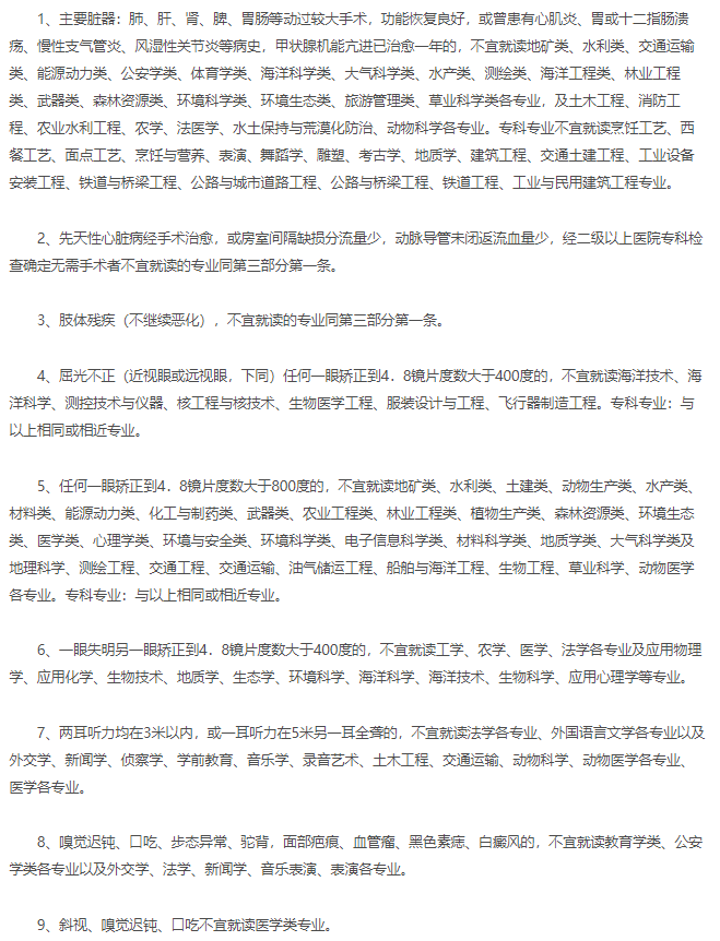 对应《指导意见》中第三部分“不宜就读的专业”部分所列条款,内容较多,建议考生要熟悉并掌握,特别是有关视力、肢体残疾等。