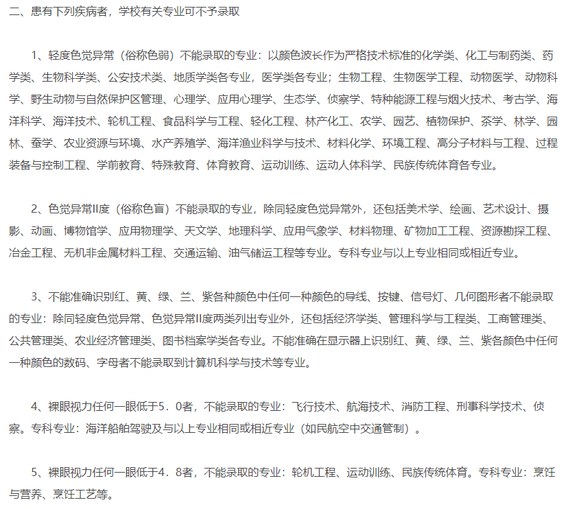 对应《指导意见》中第二部分“有关专业可不予录取”部分所列条款,主要包括视力不足、色觉异常等。这种情况主要包括以下几个方面。