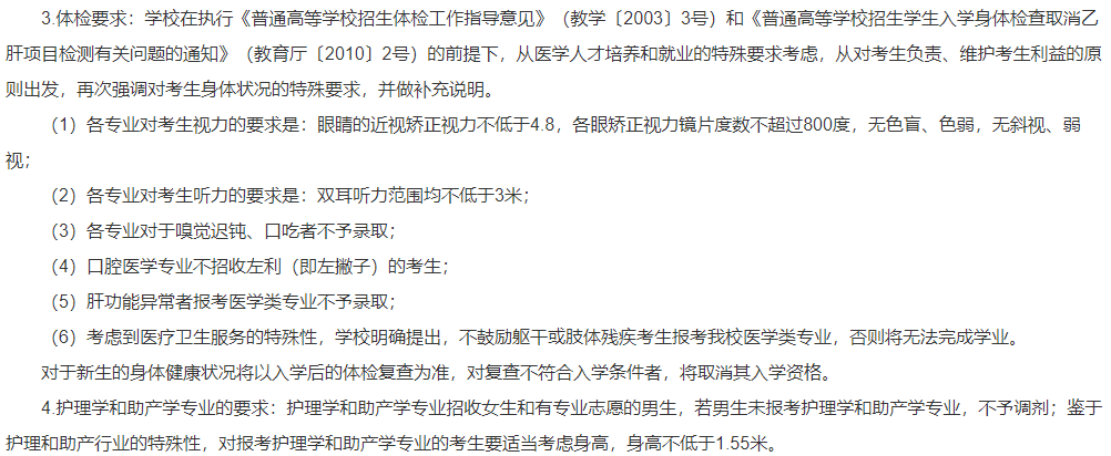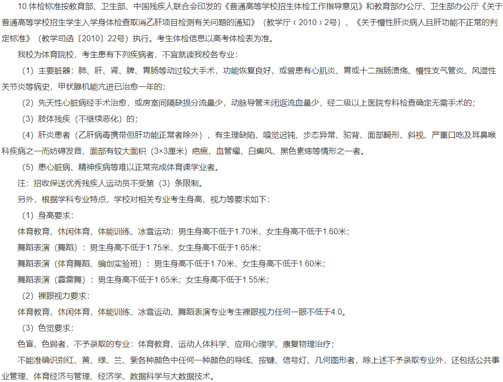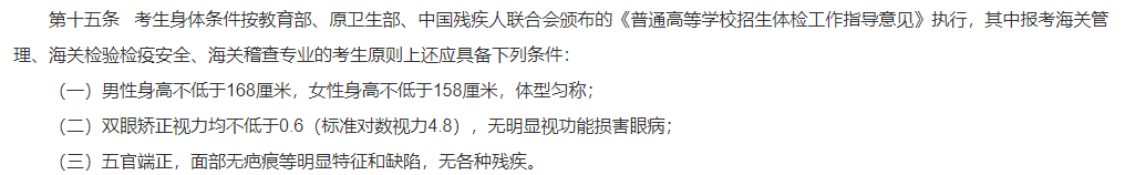 高校在招生章程中对于身体条件的补充说明,都是基于本校相关专业培养进行特别要求,没有较为统一的标准,即使是同样对身高有要求的专业,不同高校也可能要求不同。因此,不要认为符合了A院校某专业的身体要求,就想当然地认为也符合B院校的同一专业。建议考生在确定报考意向院校后,一定要仔细查阅学校当年的《招生章程》,看看是否有补充规定。