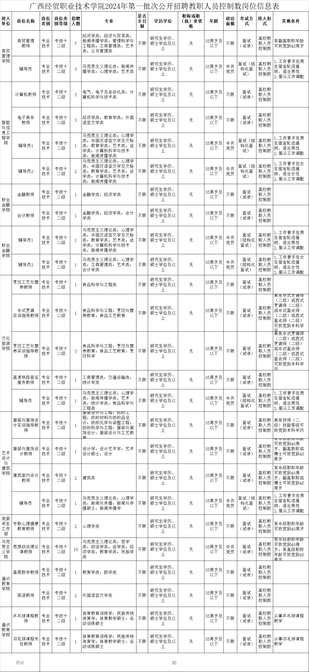 本次公开招聘教职人员控制数52名。