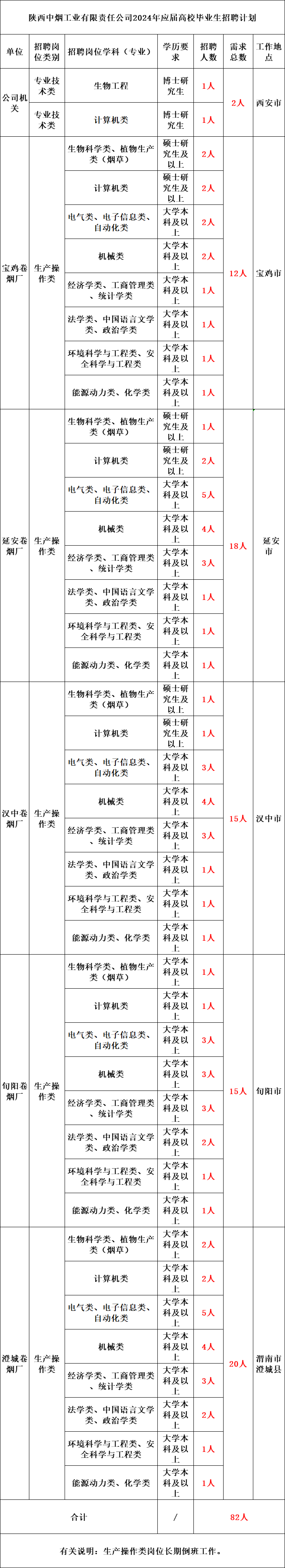 陕西中烟工业有限责任公司根据发展需要,面向社会公开招聘2024年应届高校毕业生点击获取职位表。具体事项公告如下: