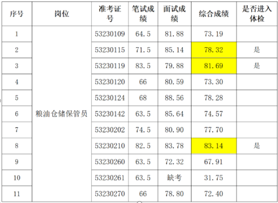 楚雄州储备粮管理有限公司2024年公开招聘综合成绩及进入体检情况公示