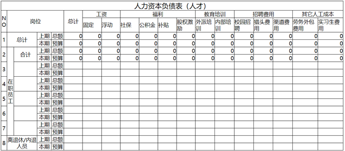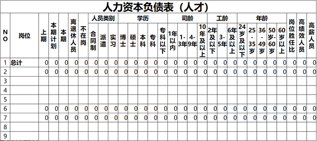 和人相关:按照上期人数、本期人数、离退休人员、不在岗人员、合同制、派遣、实习,按照学历区分,按照工龄区分。岗位胜任比是多少、高绩效人员占比多少、高薪人员有多少,全部做出来,一目了然。和钱相关:工资、奖金、福利、教育培训、招聘费用、其他人工成本,大概花了多少钱。