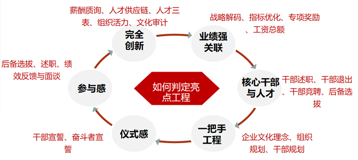 具体来看,完全创新可以做的事包括薪酬质询、人才供应链、人才三表、组织活力、文化审计;业绩强关联包括战略解码、指标优化、专项奖励、工资总额;核心干部和人才包括干部述职、干部退出、干部竞聘、后备选拔;一把手工程包括企业文化理念、组织规划、干部规划;仪式感包括干部宣誓、奋斗者宣誓;参与感包括后备选拔、述职、绩效反馈和面谈。