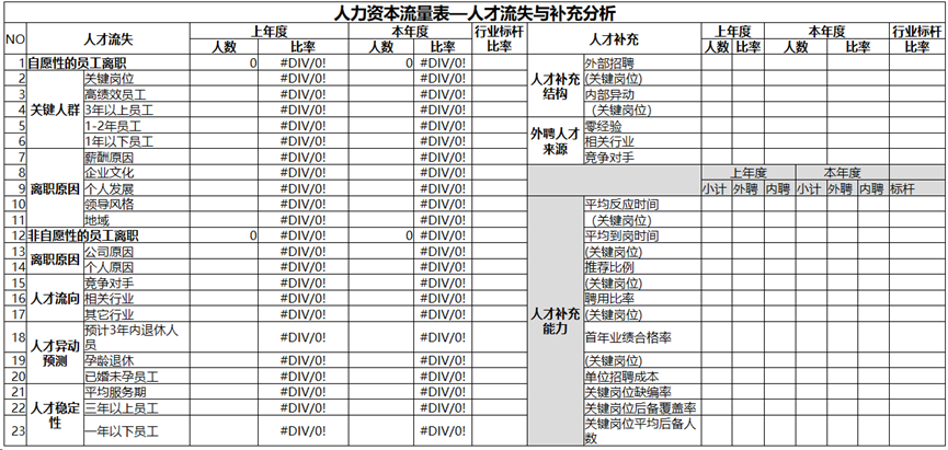 自愿性员工的离职,包括关键岗位、高绩效员工、3年以上员工、1到2年员工、1年以下员工,离职原因:薪酬原因、企业文化、个人发展、领导风格、地域。非自愿性员工的离职原因:公司原因、个人原因。人才流向:竞争对手、相关行业、其他行业。人才异动:孕龄退休、已婚未孕员工、预计3年内退休人员。人才稳定性:平均服务期、3年以上员工、1年以下员工。左边是人才的流失,右边是人才的补充。包括外部招聘、内部异动,外聘人才来源,人才补充能力:平均反映时间、平均到岗时间、推荐比例、聘用比率、首年业绩合格率。