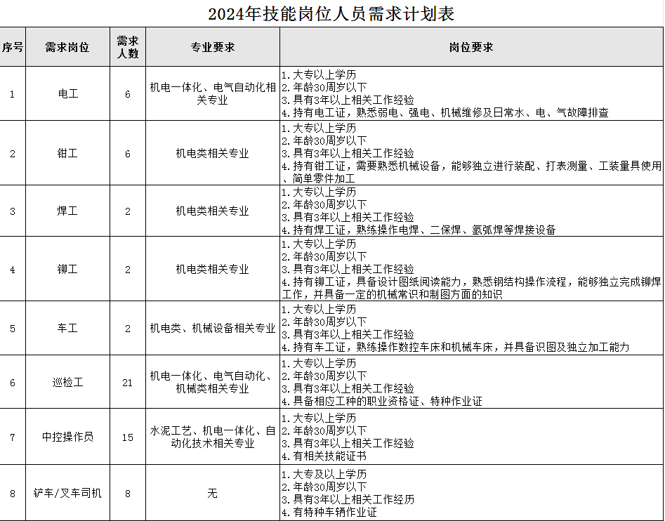 一线岗位技能操作人员100人。具体岗位、人数和专业要求等信息如下。