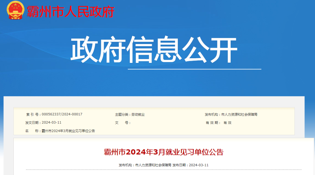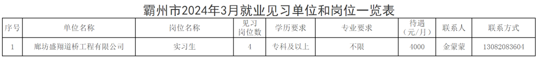附:霸州市2024年3月就业见习单位和岗位一览表