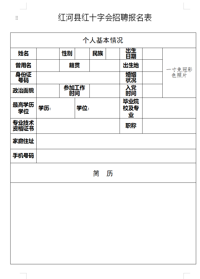 1.《红河县红十字会报名表》(附近期5分彩色相片一张)。