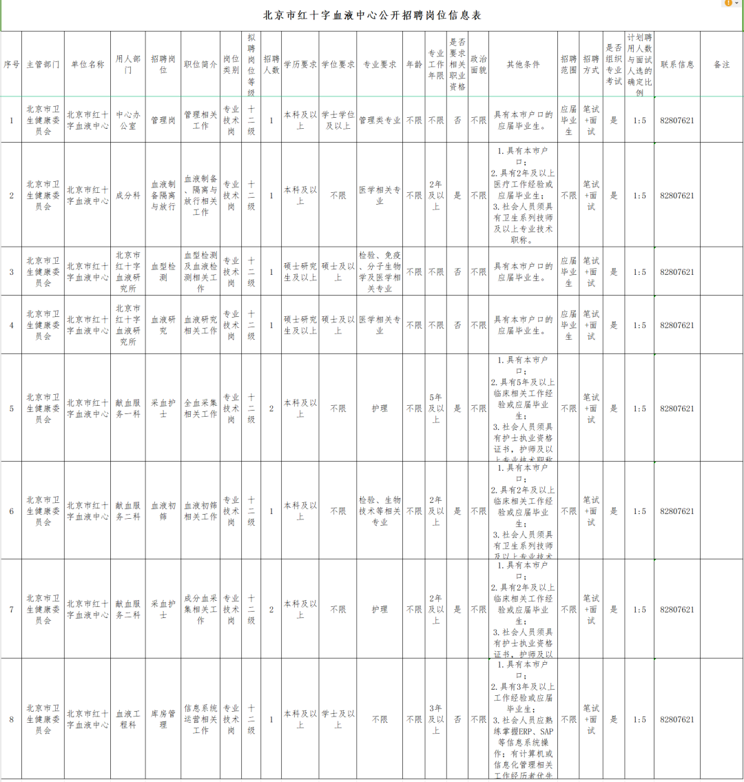 1. 北京市红十字血液中心公开招聘岗位信息表