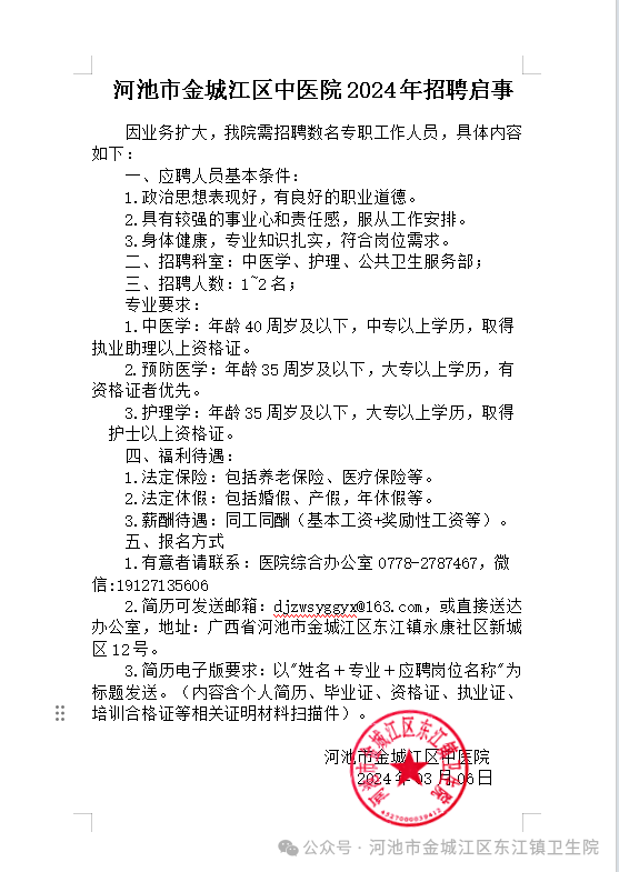 广西医护招聘,河池市金城江区中医院2024年招聘