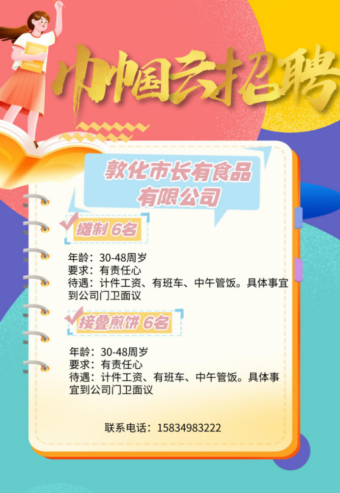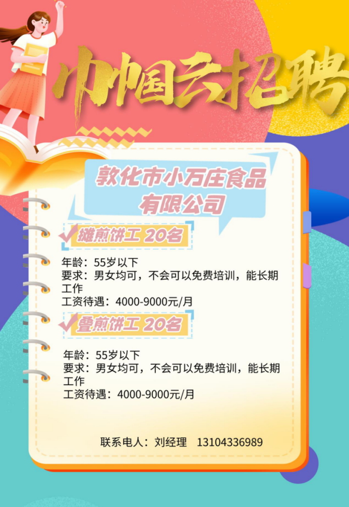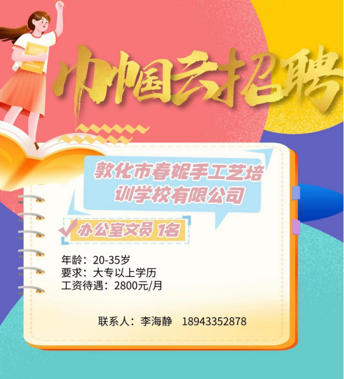 为全面贯彻党的二十大和二十届二中全会精神,围绕中国妇女十三大目标任务,坚决落实省州关于就业工作决策部署,深入开展“巾帼就业创业促进行动”,全力稳就业、保用工、促发展。按照2024年“春风行动”的相关要求,州妇联围绕“春风送岗促就业,精准服务助发展”这一主题,不断优化升级巾帼招聘服务方式,广泛收集巾帼企业用工岗位信息,从即日起通过州妇联微信公众号发布岗位招聘信息,为用工企业和求职者搭建精准对接平台,实现高质量充分就业。 春风已到,巾帼护航, 一“职”为你! 今天要发布招聘岗位的企业有:敦化市小万庄食品有限公司、敦化市春妮手工艺培训学校有限公司、敦化市长有食品有限公司。