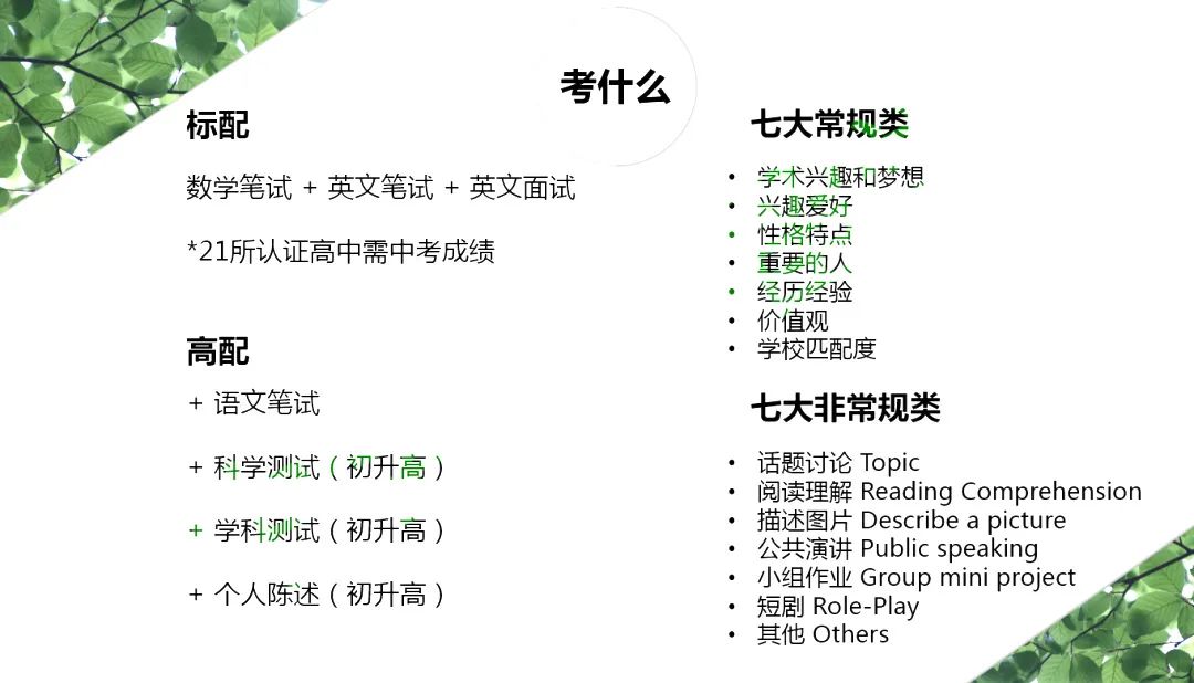 入学考试标配是数学、英语及面试,高配会有语文、科学、个人陈述等。