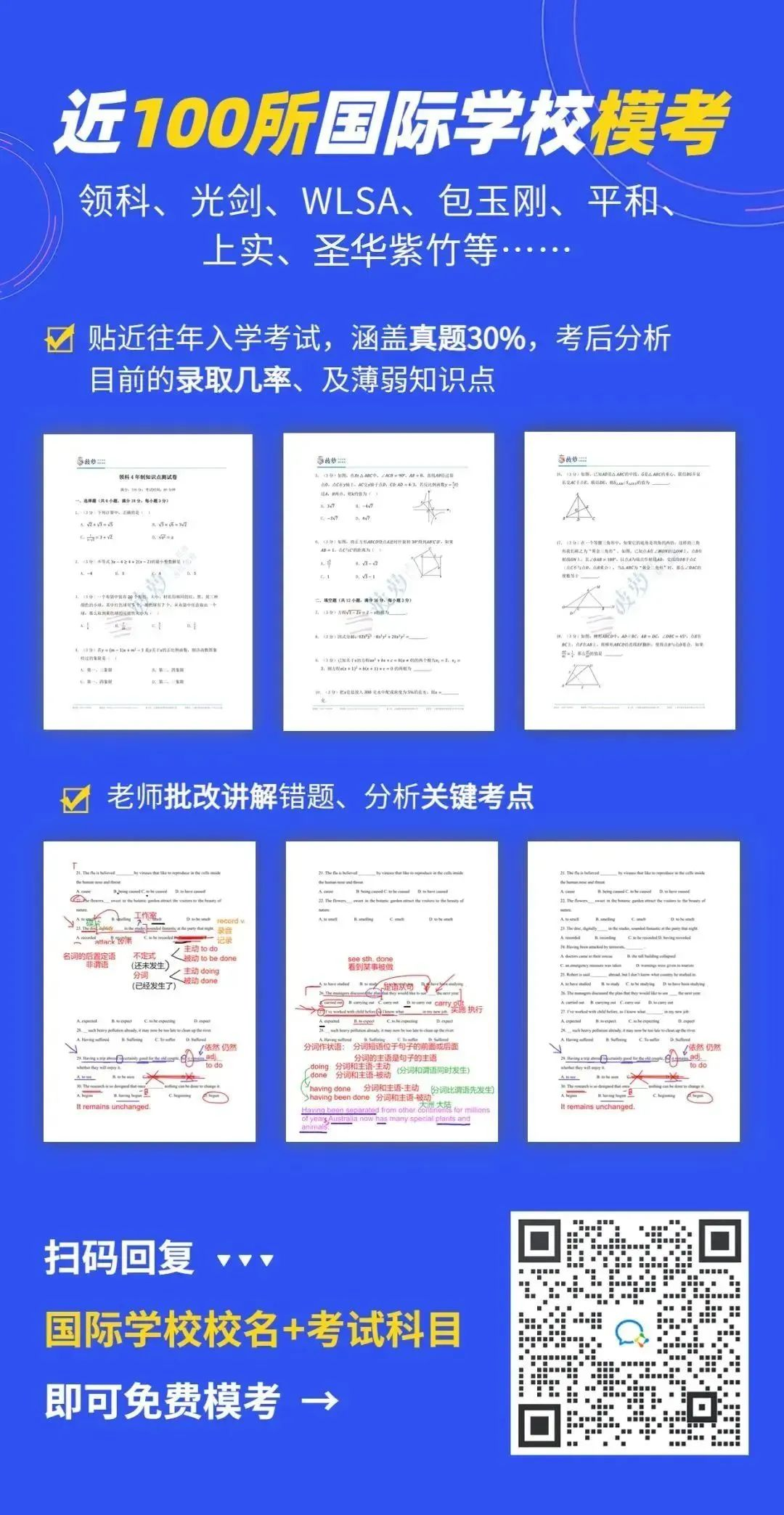 如果你想要测测你的成绩是否可以获得录取。可预约WLSA、领科、光剑、包玉刚、平和、上实等100+所国际学校模考,扫码回复: