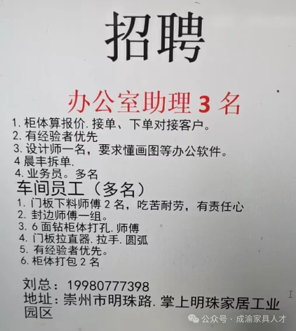 本公司专业生产新中式实木成品及全屋定制家具,因生产需要,现诚聘如下人员: