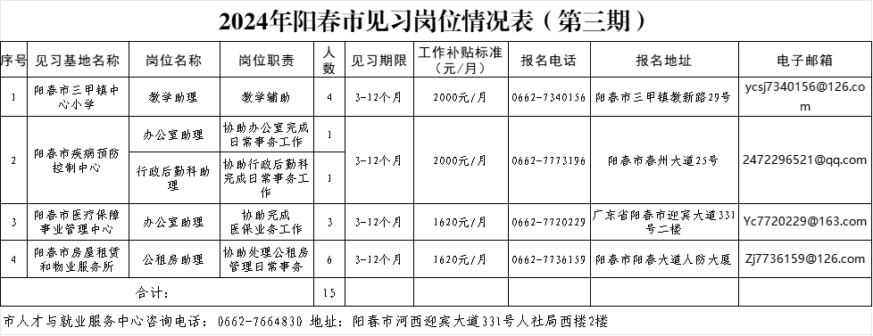 为进一步增强离校未就业高校毕业生的综合素质和职业能力,引导高校毕业生通过见习实现就业,提升就业见习对高校毕业生的就业支撑力,现有阳春市三甲镇中心小学、阳春市疾病预防控制中心、阳春市医疗保障事业管理中心、阳春市房屋租赁和物业服务所面向社会公开招募15位见习生(见习岗位信息详见附件1),欢迎广大符合条件的离校未就业(毕业两年内)高校毕业生、登记失业的16-24岁青年踊跃参与。具体情况公告如下:
