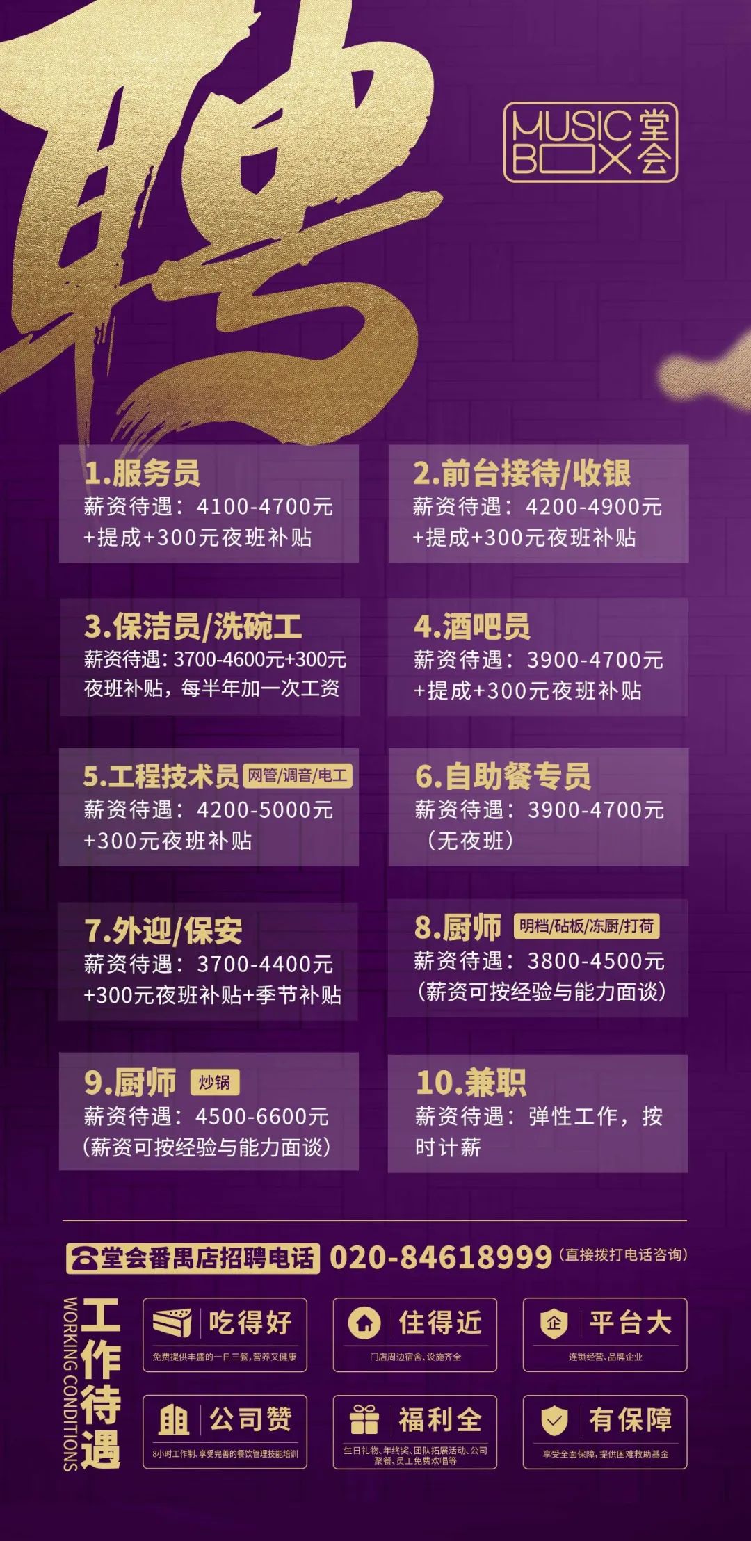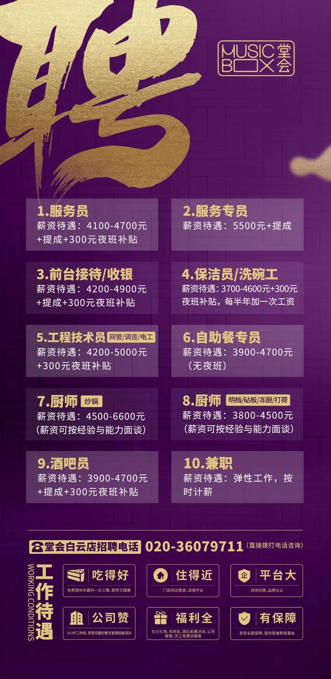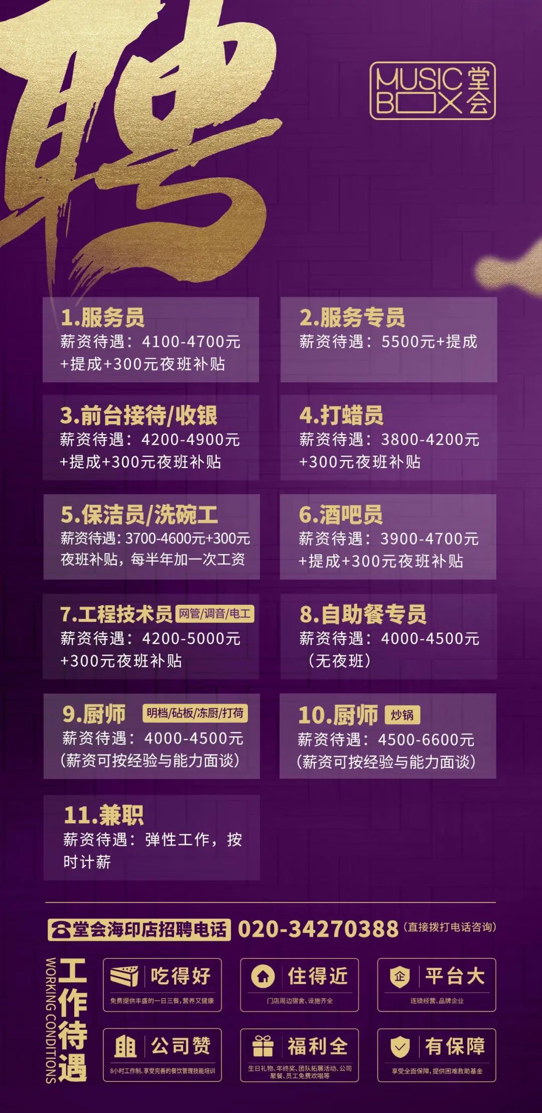 兼职全职!大型连锁品牌广州多区招人!免费三餐、提供宿舍、年终奖、聚餐等,福利全、有保障~广州堂会发展控股有限公司招贤纳士
