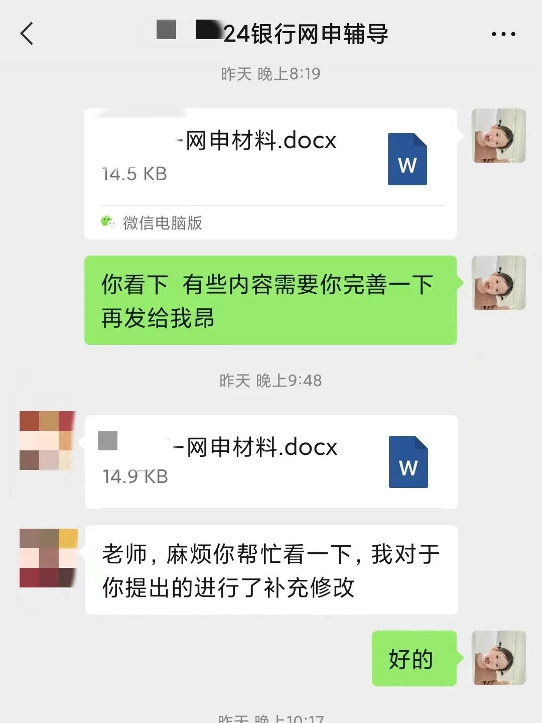 4.进入辅导流程,微信/电话沟通,提出填写意见或修改意见,在个人填写基础上,进行内容审核,确定内容。仔细审核无误后提交网申。