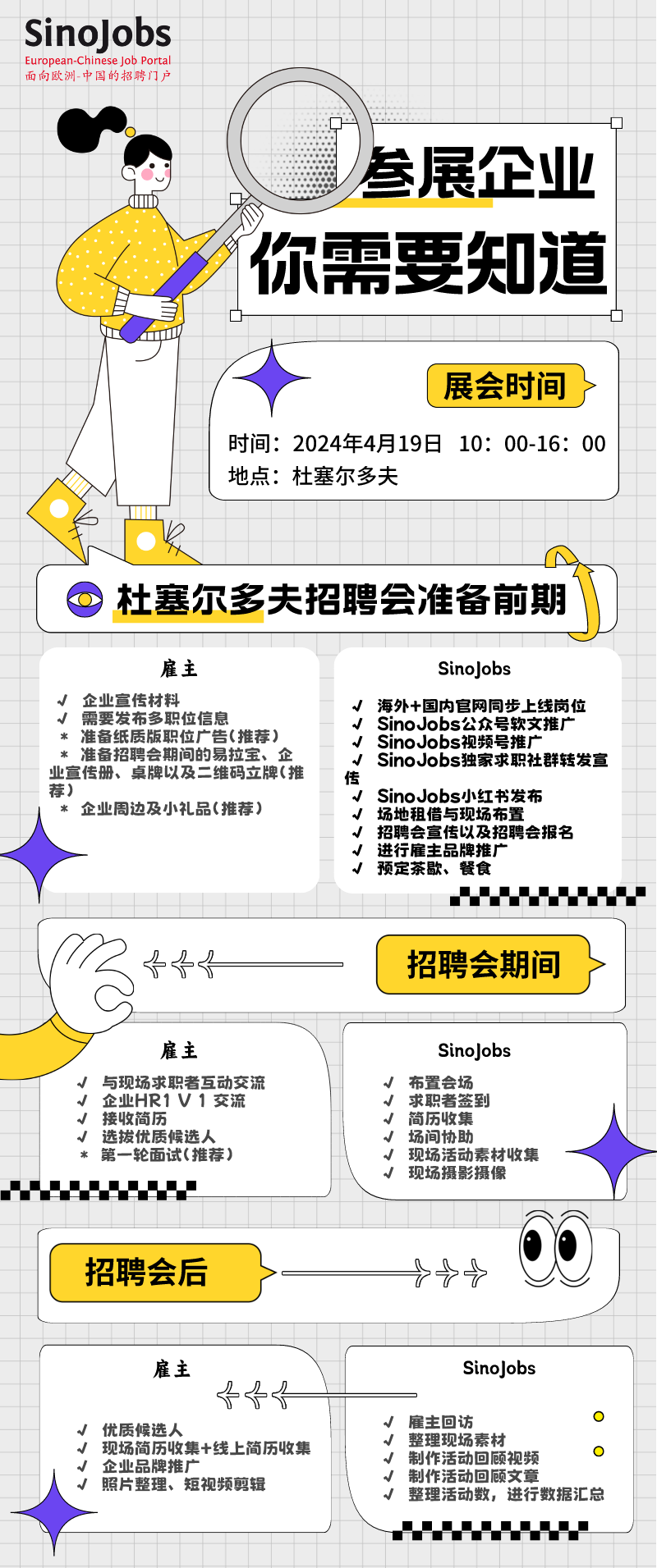 继2023年SinoJobs秋季线下招聘会成功举办后,今年4月份SinoJobs将再次带来线下招聘会——杜塞尔多夫场,为企业提供与潜在的顶尖人才直接面对面交流的机会,以满足企业的招聘需求。