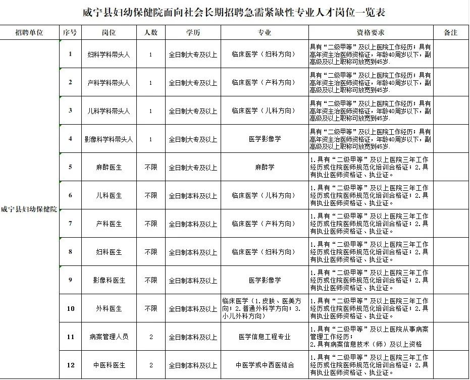 具体岗位详见附件《威宁县妇幼保健院面向社会长期招聘急需紧缺性专业人才岗位一览表》。