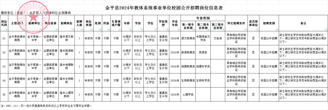 招聘岗位由招聘单位编报,招聘专业、学历等与岗位资格条件相关的问题,由招聘单位和主管部门负责解释。详见《金平县2024年教体系统事业单位校园公开招聘岗位信息表》(附件1)。