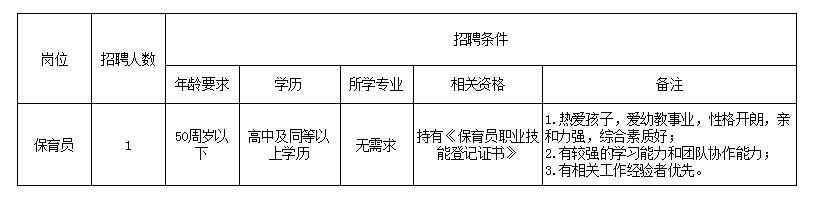 洛阳市涧西区建设路幼儿园是一所政府公办幼儿园,位于建设路西段,园所一期开设6个教学班,为满足园内工作发展需要,现拟招聘幼儿园保育员1名(详见附件1)。