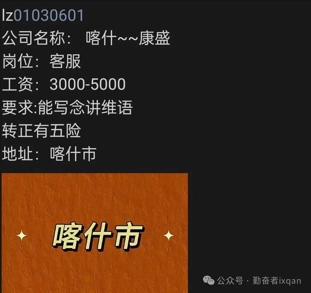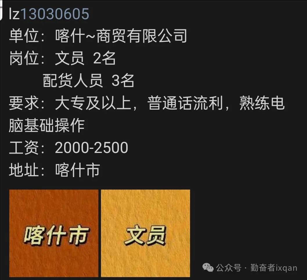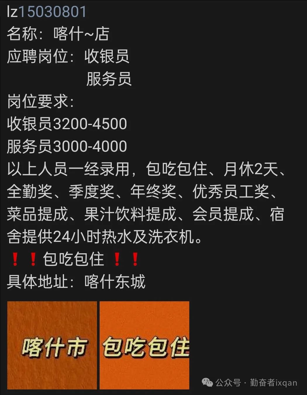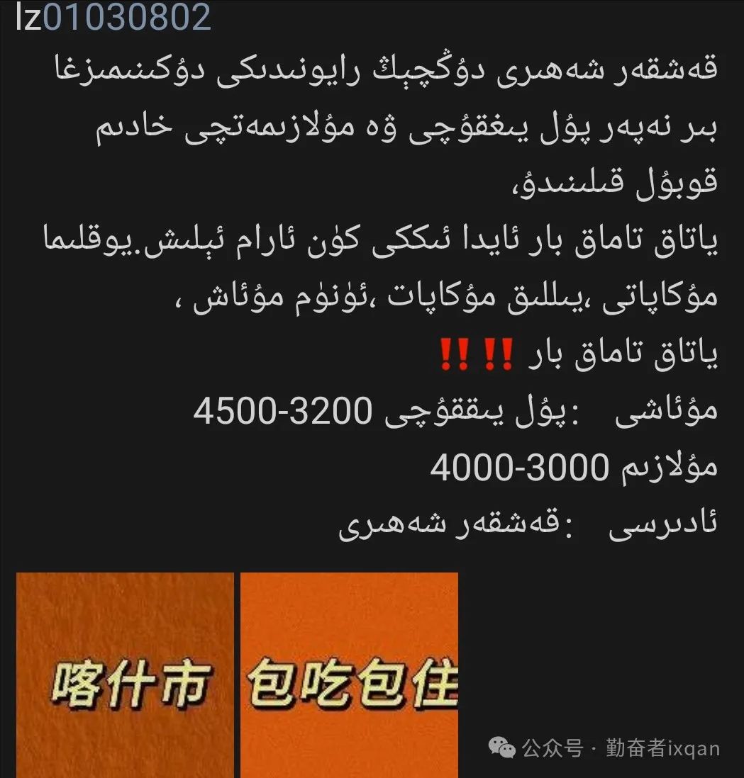 قەشقەردىكى مەلۇم بىر شىركەت كەڭ كۆلەمدە خىزمەتچى خادىم قوبۇل قىلىدۇ مۇقىم مائاش 3000元ياتاق بىلەن تەمىنلەيدۇ ئادىرسى قەشقەر شەھىرى ❗❗免费信息 包住❗❗