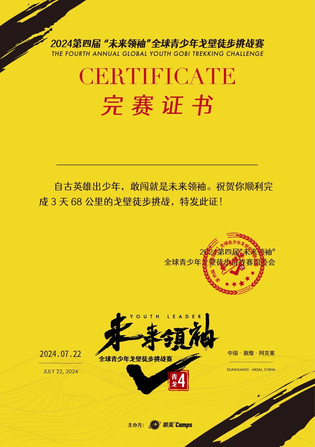 2021年7月11日,首届“未来领袖”全球青少年戈壁徒步挑战赛在中国敦煌阿克塞扬帆起航,近400名来自全国各地的青少年们一起穿峡谷、越沙漠、跨河道、走戈壁,6天5晚,游美与家长们一同见证了青少年领袖的诞生。2021年7月16日,首届未来领袖全球青少年戈壁68KM挑战赛圆满落幕。