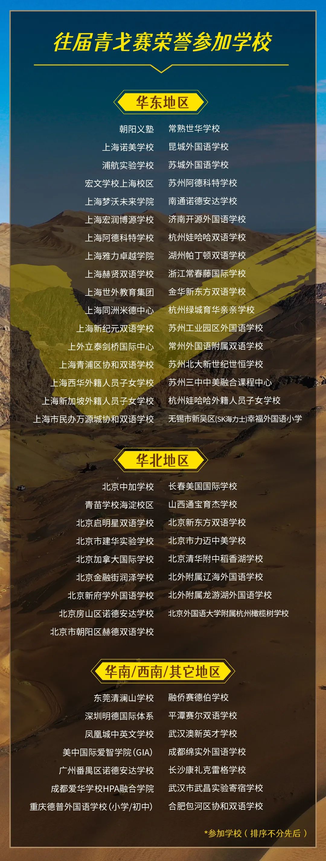 第四届“未来领袖”全球青少年戈壁徒步挑战赛(简称青戈赛或青戈4)是由营地教育主办,国际(化)学校共同发起并参与,全球各地的青少年在敦煌戈壁上共同参与的一场6天5夜68公里的戈壁徒步+戈壁大讲坛+戈壁音乐节为一体的综合性赛事活动。