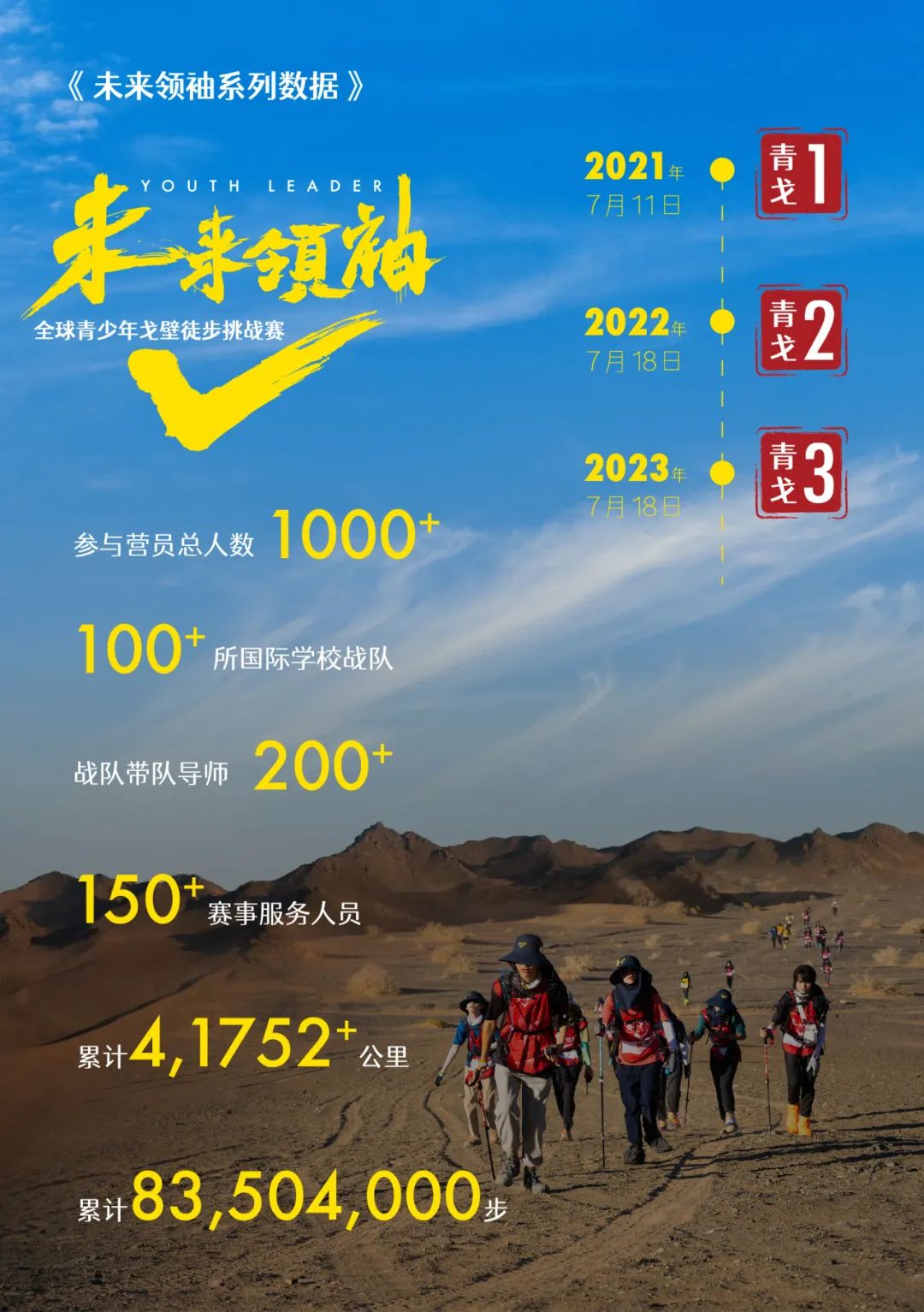 戈壁徒步挑战赛是时下社会精英群体及高校商学院最热门的活动,怀着让青少年也能真正走一次戈壁,通过戈壁磨砺每个人“不放弃、不抛弃”的精神。营地教育于2021年在中国敦煌阿克塞首次发起以青少年为主、全球最大规模的首届“未来领袖”全球青少年戈壁徒步挑战赛(青戈1)。