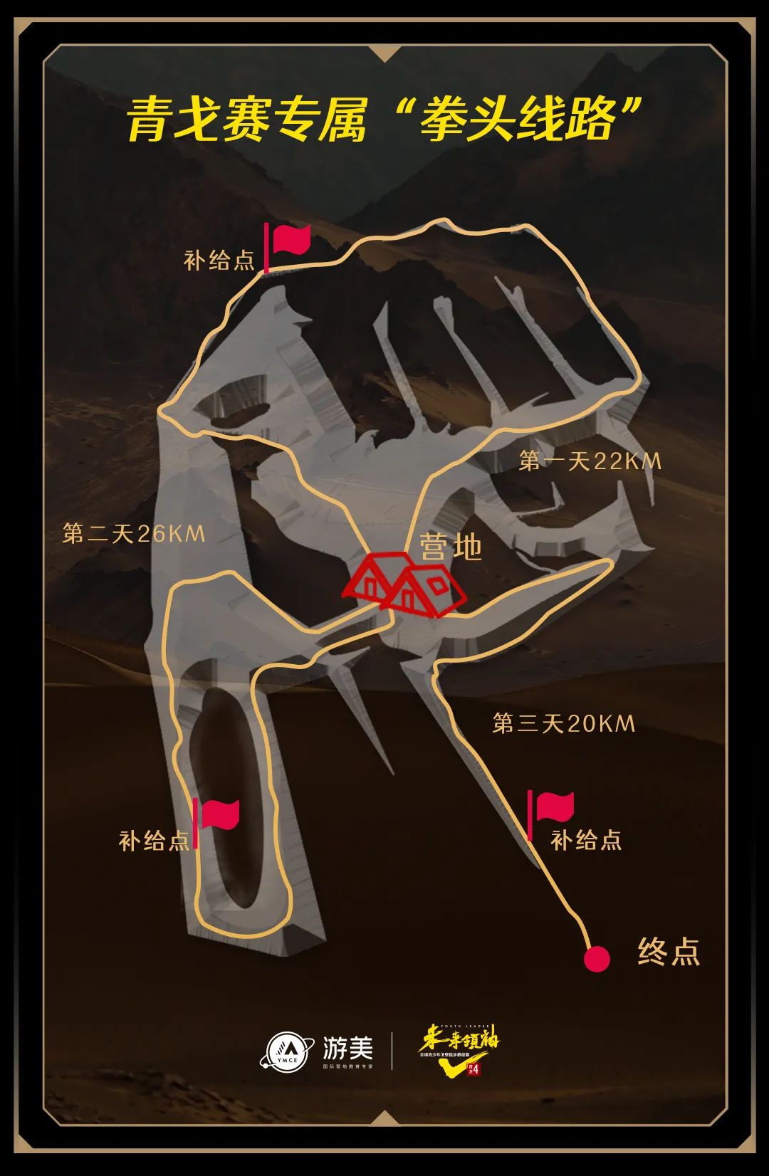 青戈赛每一天的环节都经过精心设计,因为我们知道教育从来不是灌输。专为赛事设计的“拳头”线路象征着孩子们完成戈壁徒步行走坚定的信心;重磅嘉宾奥运冠军“王丽萍”、全球第一位完成戈壁108公里挑战赛的腿部截肢者“独脚潘”将和孩子们共同体验行走戈壁,在大漠戈壁为孩子们的成长进一步赋能;而戈壁音乐节是孩子们尽情展示才华的绝佳舞台。每个细微环节的设置,都为青戈赛注入生生不息的活力,使得“未来领袖”毅行的脚步迈的更加坚定有力!