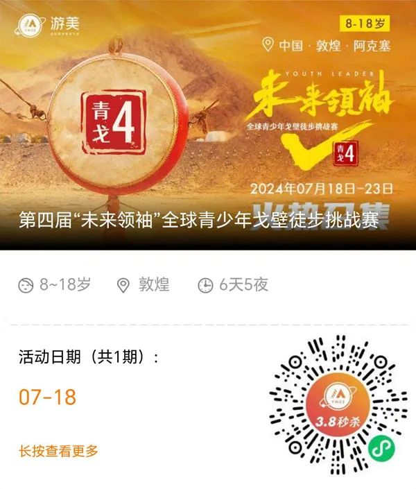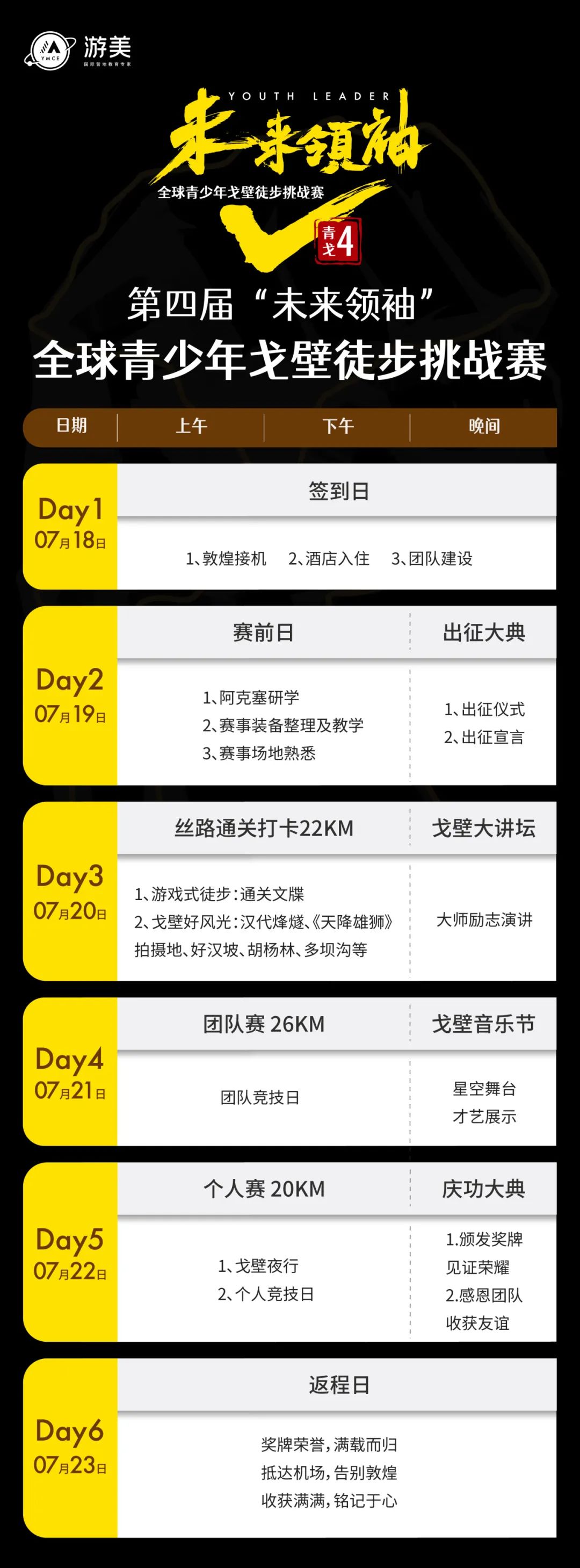 2024年夏天,我们将连续四年带领青少年徒步行走在敦煌茫茫戈壁当中,开启一场挑战之旅,这是在全中国打造的专属于全球青少年的戈壁赛事。