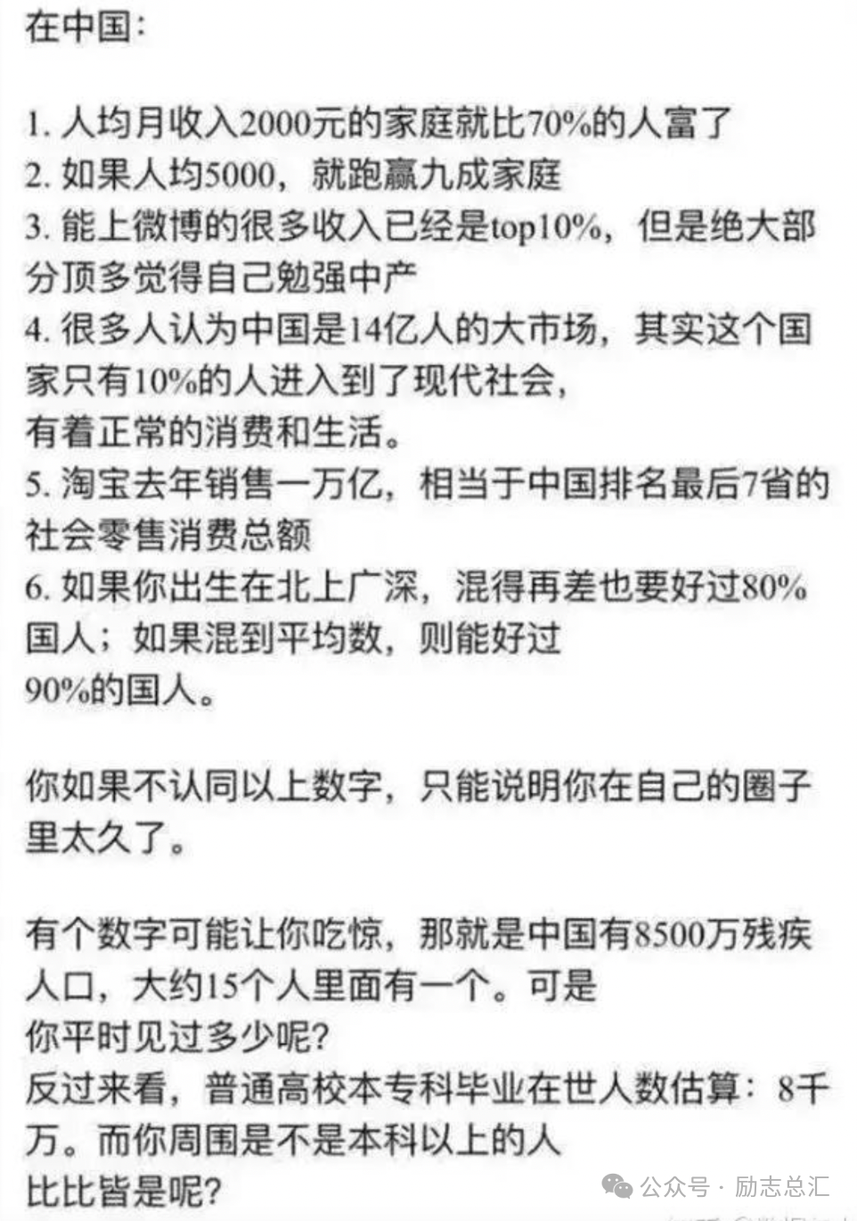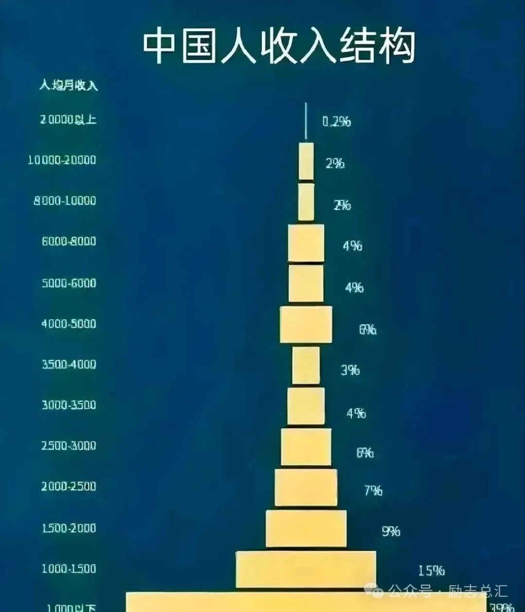 在当今天这个社会,发现一个很特别的现象,就是你在自媒体中人人都是奔驰、宝马、保时捷,都是年薪百万,甚至千万。但是现实生活中可能就很难遇到这样的有钱人,或许在一个公司区域老大或者是企业中高管,各大品牌区域总经销老板有这样的实力。往往在现实生活中也是有钱的人,越显得很低调,叫闷声发大财,就怕别人知道了他的发财之道。相反的哪些天天到处吹牛炫耀自己多有钱的人,恐怖囊肿羞涩。那么到底月薪一万在我国是一个什么收入水平呢?我们来看一组网络统计的数据。从数据来看月薪1000以下的人员已经占比39%了,因为中国是农业大国,大部分是农民没有工作,靠农耕农作收入很低。李克强总理:中国是一个人口众多的发展中国家,我们人均年可支配收入是3万元人民币,但是有6亿中低收入及以下人群,他们平均每个月的收入也就1000元左右。 最后,不管咱们收入在哪个水平重要,重要的是需要一个积极乐观的生活态度,只要钱够花即可,如果想过更好的生活就要积极向上努力去奋斗。相信只要努力,靠自己赚钱的来的每一分钱都是幸福的。超越自己才最厉害,平常心态,健康最重要。