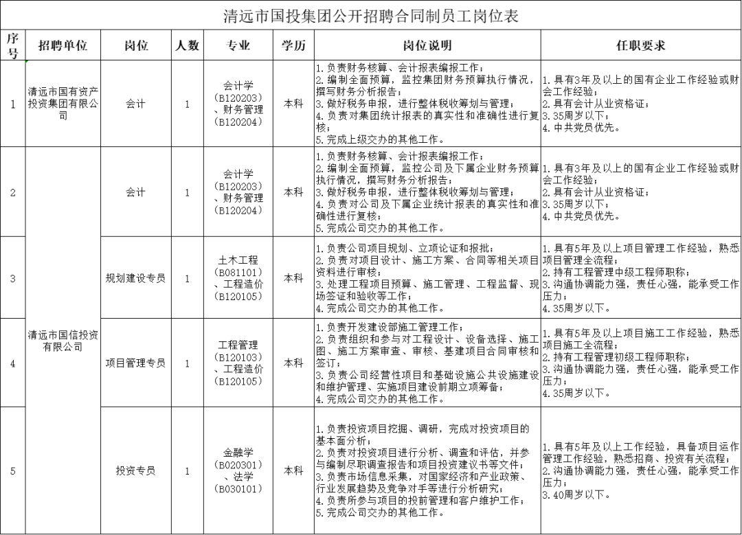 清远市国有资产投资集团有限公司(以下简称:清远市国投集团)于2020年12月挂牌成立,是清远市市属国企四大集团之一,为“AA”主体信用等级国有企业。清远市国投集团在清远市委、市政府坚强领导和清远市国资委监督管理及支持下稳步发展,形成了产业园区开发、交通投资、数字和人工智能、资本运营四大业务板块和综合服务、人力资源服务两大支撑服务的“4+2”主业布局。目前,清远市国投集团旗下全资、控股、代管及参股企业43家。 根据业务发展需要,清远市国投集团及其代管企业清远市国信投资有限公司现需面向社会公开招聘合同制员工,有关事项公告如下:1、拥护中华人民共和国宪法,拥护中国共产党领导和社会主义制度;1、近两年在公开招聘(录)考试、体检或考察中存在违纪行为的;2、因涉嫌违法违纪正在接受审计、纪律审查,或涉嫌犯罪,司法程序尚未终结的;3、现役军人,机关事业单位见习期、服务期未满的在编在职人员;各招聘岗位具体任职要求详见《清远市国投集团公开招聘合同制员工岗位表》。 2024年3月9日9:00-2024年3月17日24:00,逾期不接受报名。本次招聘委托清远市国源南粤人才服务有限公司按照以下程序开展:应聘人员在报名时间内,将个人报名材料发送至邮箱zhaopin@qygyny.com,邮件主题格式为:姓名+市国投集团/市国信公司+应聘岗位,报名材料包括以下内容:2、本人二代身份证、学历及学位证书、专业技术资格证书、职(执)业资格证书、无犯罪记录证明扫描件;4、岗位任职要求的其他证明材料(有关工作经验需提供工作证明或社保缴纳明细证明)。清远市国源南粤人才服务有限公司按照岗位应聘条件、任职要求对报考者所提交的资料进行资格审核。各岗位通过资格审查的,将通过电话或短信形式通知应聘者参加考试。资格审核贯穿招聘工作全过程,如有弄虚作假,违背诚信承诺或隐瞒有关情况的,一经查实,取消应聘资格。1、笔试。笔试科目为综合能力测试。笔试成绩满分为100分,合格线为60分。笔试成绩四舍五入后保留2位小数。笔试时间地点另行通知。2、面试。笔试成绩从高到低按1:3的比例确定每个岗位进入面试人员;达不到1:3比例的,全部笔试成绩合格人员确定为进入面试人员。面试成绩四舍五入后保留2位小数。3、综合成绩。综合成绩=笔试成绩×50%+面试成绩×50%。综合成绩总分为100分,合格线为60分,成绩保留小数点后两位。综合成绩不合格的不予录用。1、体检。按照考试综合成绩由高至低等额确定每个岗位参加体检的人选。参照《广东省事业单位公开招聘人员体检实施细则(试行)》(粤人社发〔2010〕382号)执行。应聘人员对体检结果有异议的,须在2个工作日内提出复检申请(但对心率、血压等能当场告知的检查结果有异议的,应当场申请复检,经同意后进行复检),逾期视为放弃;复检只能进行一次,以复检结果为最终体检结论。2、考察。考察工作组对拟聘用人员进行考察或背景调查,视情况采取实地走访、个别谈话、审核人事档案、查询社会信用记录、同本人面谈等方式进行。拟聘用人员在体检、考察环节出现不合格或个人放弃的情况,按照同一岗位综合成绩由高到低的顺序依次递补。拟聘用人员名单在清远市国投集团和清远市国源南粤人才服务有限公司微信公众号进行公示。经公示不影响聘用的,由用人企业按有关规定办理聘用手续,签订劳动合同。聘用人员为合同制员工,薪酬标准按用人企业薪酬制度执行。(一)报名咨询电话:曾小姐0763-3388919;岗位咨询电话:周小姐、梁小姐0763-3386396。(二)咨询时间:工作日9:00-12:00,15:00-17:30。(一)每人只能申报一个岗位,根据报名条件和岗位任职要求,按照人岗相适原则进行资格审查,资格审核未通过的不再另行通知;(二)报考者报名时,须准确填写本人联系方式,并保持通讯畅通,如因本人原因导致无法及时联系的,自行承担责任;(四)中共清远市国有资产投资集团有限公司纪律检查委员会对本次招聘工作实行全程监督,受理投诉举报,电话:0763-3328130。